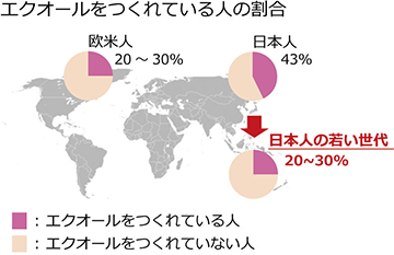 エクオールを体内で産生できる人の割合は日本人で約50%、欧米人では約20~30%と言われています。日本以外でも中国、韓国、台湾など、大豆を多く摂取している地域はエクオールを産生できる人の割合が高いということが分かっています。エクオール産生量は、大豆の摂取量や腸内環境によって差が生じるのかもしれません。